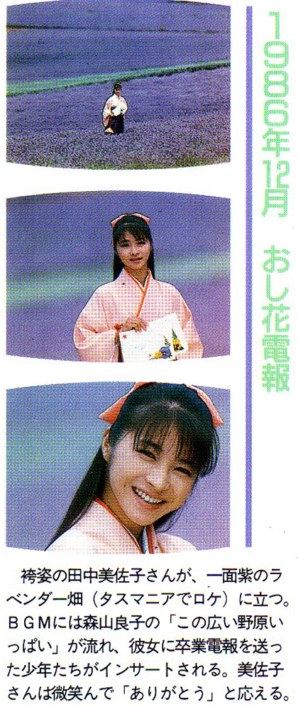 やや強引な話題。「本日も晴天なり」のキャスト欄に登場する名前が最初は“田中美佐”でした。それが何話からだったのか忘れましたが途中から“美佐子”に変わりました。デビュー作とされる「想い出づくり」はずっと“田中美佐”のままだったので「本日~」は“美佐”と“美佐子”が同居する貴重なドラマだったと言えるのかも…。