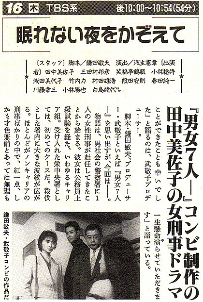 misaさん、「眠れない夜をかぞえて」は私も思い入れがある作品です。再放送されないということもあり2回ほどYouTubeにアップしたことがあります。でも、あるところからのクレームでアッという間に削除されてしまいました。主題歌が流れるタイトルシーンも権利関係に触れるようです。ま、私のHPなら文句はきそうにないので…。