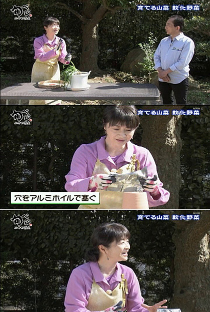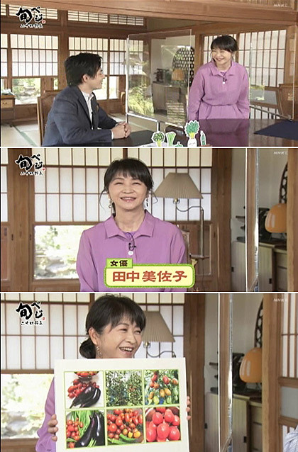 4月12日の美佐子さんのページで紹介された3枚の写真。そのうち1枚は「やさいの時間~旬ベジ・二十四節気」と完全に一致。でも他の2枚は微妙に一致せず…。となると2回目放送の「ソラマメ」(5月22日)で着用したもの?