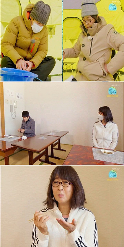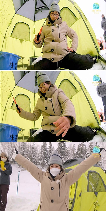 ↓「釣りびと万歳」~ワカサギ釣り対決で美佐子さん勝利